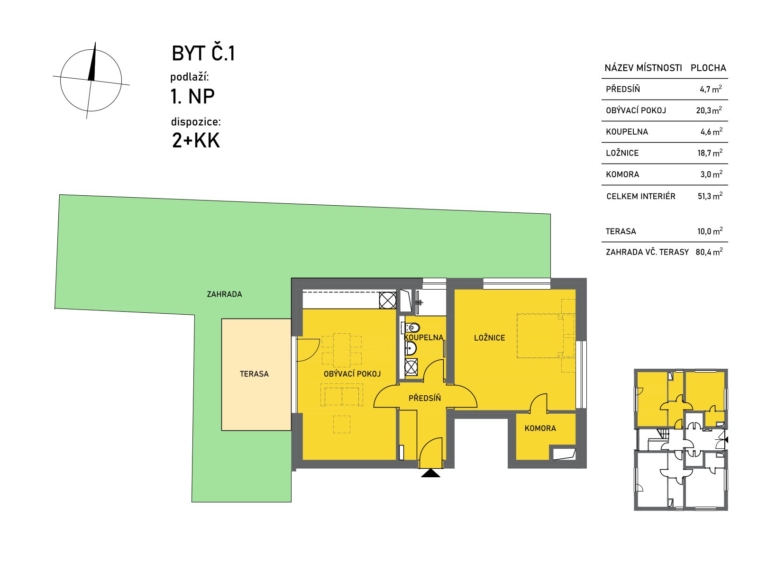 | č. 1 | 2+kk | 51,3 m2 | 80 m2 | - | Rezervace |