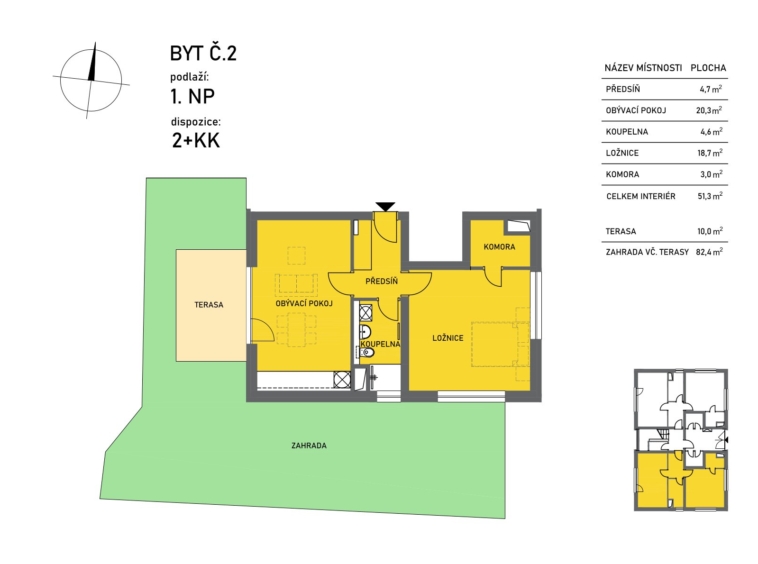 | č. 2 | 2+kk | 51,3 m2 | 82 m2 | - | Rezervace |
