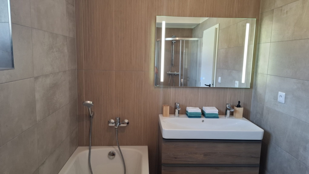 Koupelna je dokončena včetně zařizovacích předmětů. Můžete se těšit na sprchový kout, vanu, velké umyvadlo se dvěma bateriemi, ke kterému se pohodlně vejdou dva lidé vedle sebe a v neposlední řadě saunu na míru, která poskytne příjemný relax po náročném pracovním či sportovním...