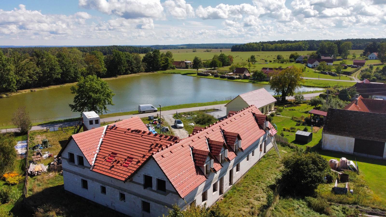 Stavba je pod střechou, právě probíhá usazení posledních kusů střešní krytiny. Vevnitř mezitím probíhají práce na příčkách. Během podzimu budou osazena okna a začne instalace TZB – voda, odpady, elektroinstalace, vytápění a vzduchotechnika.