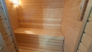Koupelna je dokončena včetně zařizovacích předmětů. Můžete se těšit na sprchový kout, vanu, velké umyvadlo se dvěma bateriemi, ke kterému se pohodlně vejdou dva lidé vedle sebe a v neposlední řadě saunu na míru, která poskytne příjemný relax po náročném pracovním či sportovním dni.